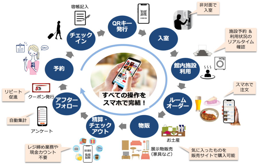 旅マエの予約から、旅ナカの滞在、旅アトのアフターフォローまで、一貫してお客様のスマートフォンでサービスを提供することができます。