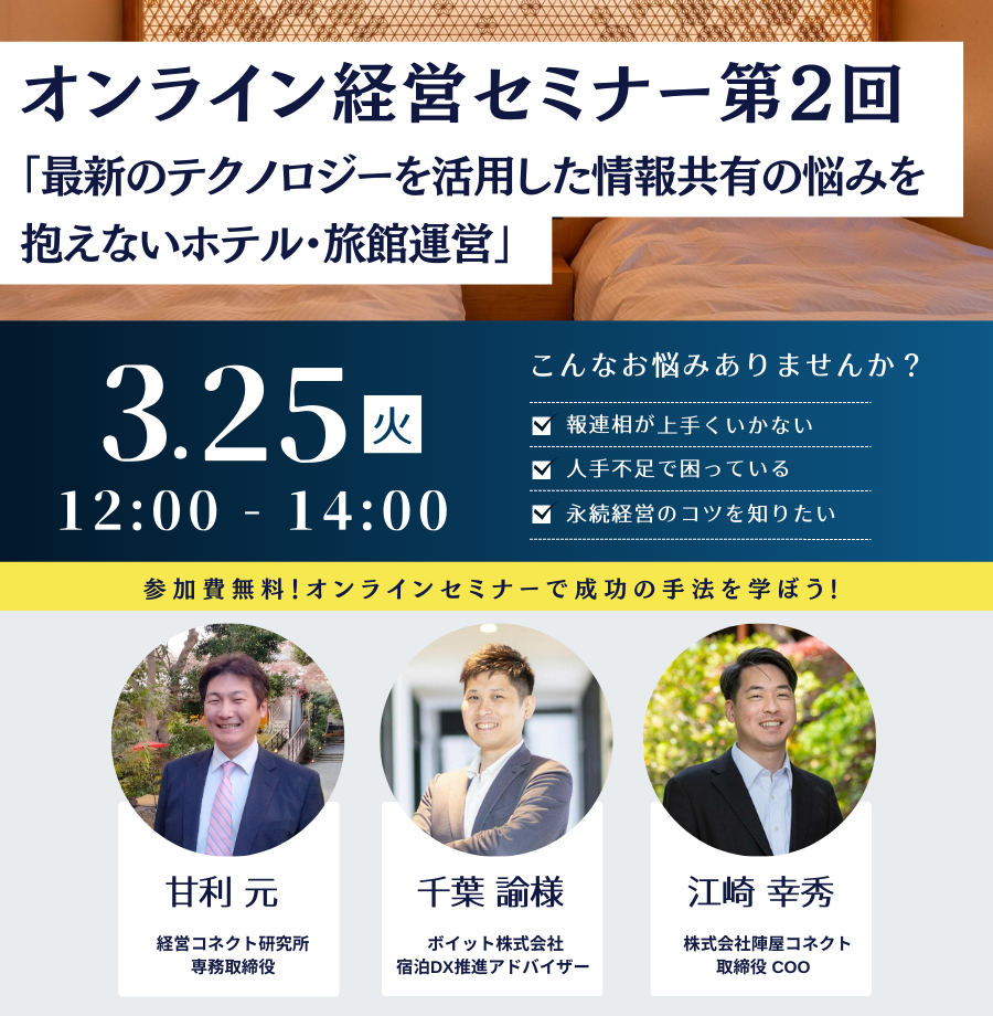 3月25日(火)にオンラインセミナーを開催いたします。第2回のテーマは次世代の宿泊施設運営の鍵となる、「最新のテクノロジーを活用した情報共有の悩みを抱えないホテル・旅館運営」です。参加費無料、ぜひご参加ください!