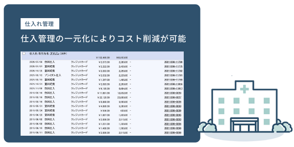 また、仕入管理を一元化することで、担当者が各仕入先・種別・科目など毎にきめ細かくチェックを行えるようになり、仕入コスト削減を実現します。
