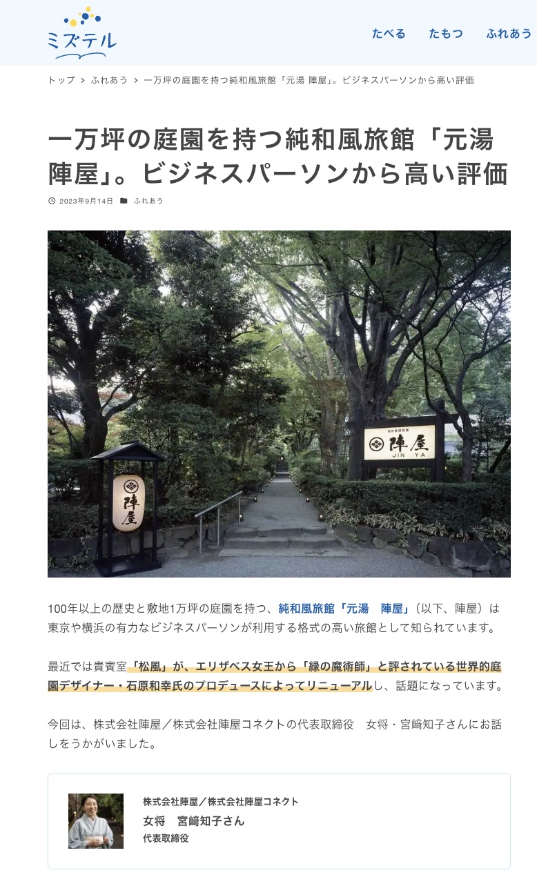 100年以上の歴史と敷地1万坪の庭園を持つ、純和風旅館「元湯 陣屋」(以下、陣屋)は東京や横浜の有力なビジネスパーソンが利用する格式の高い旅館として知られています。最近では貴賓室「松風」が、エリザベス女王から「緑の魔術師」と評されている世界的庭園デザイナー・石原和幸氏のプロデュースによってリニューアルし、話題になっています。今回は、株式会社陣屋/株式会社陣屋コネクトの代表取締役 女将・宮﨑知子さんにお話しをうかがいました・・・・